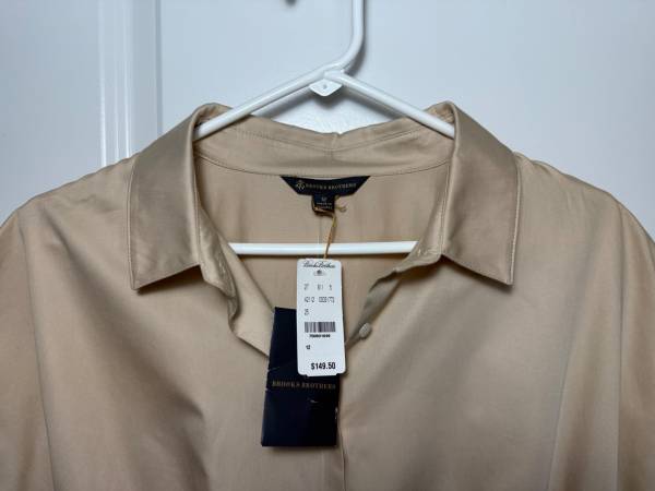 This gorgeous khaki or light tan colored dress by BROOKS BROTHERS was purchased BRAND NEW from their store, NEVER WORN, and stored in my clean and smoke-free home. It is a women’s size 12 and crafted of 100% high quality premium cotton.