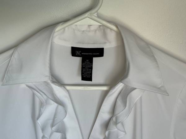 The gorgeous white woven white top with beautiful ruffles matches perfectly with the black knit bottom to create a very classy look! It is a woman’s size 14. The length from the edge of the shoulder down to the bottom of the dress is about 38 inches.