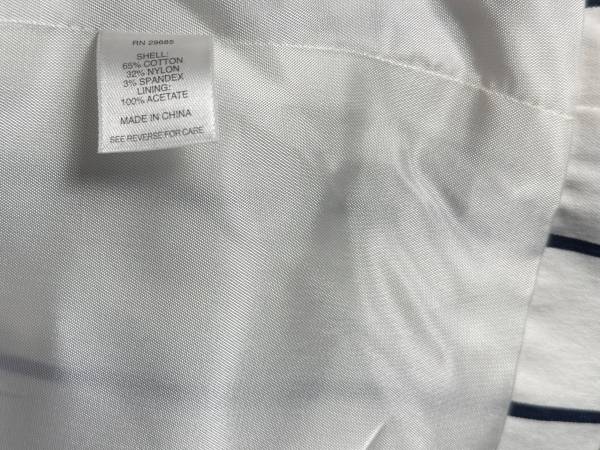 The main color is a beautiful soft white with dark navy blue pinstripes spaced about one + one half inches apart.
