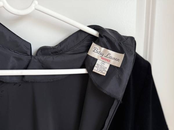 This stunning BETSY LAUREN PETITES black velvet dress was purchased brand new from Macy’s, worn once, and stored in my clean and smoke-free home. It is a women’s size 14. The black velvet is wonderfully soft and attractive, not easy to photograph but it is in absolutely perfect condition!