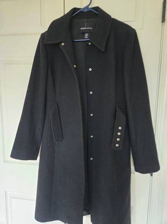 Ladies black coat with snap front closure. Mid length and a half snap belt. Great condition