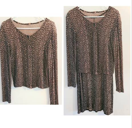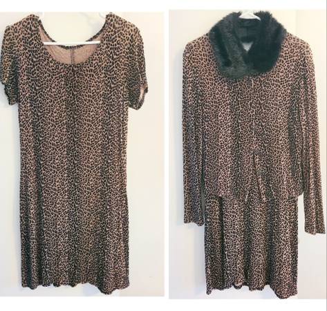 Lightweight, short sleeve dress with a matching button-up jacket that has an optional, button-on, faux fur collar. Stretchy material. Versatile outfit.