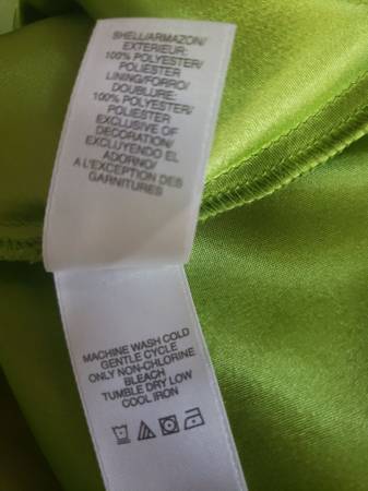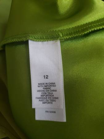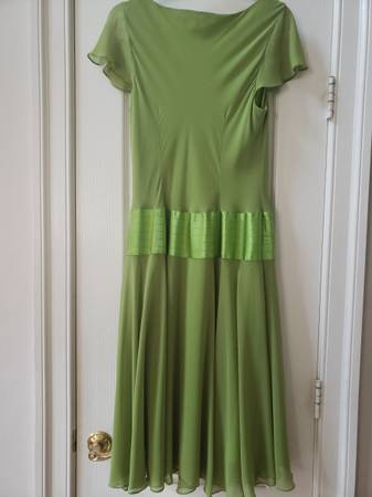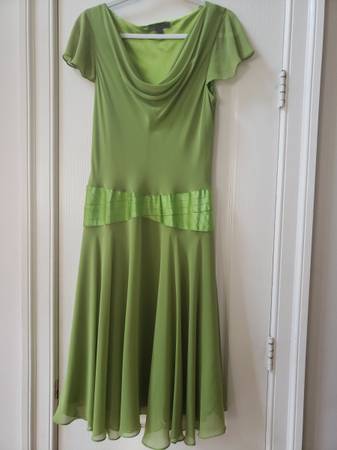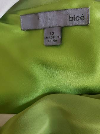 Size 12 apple green dress by Bice. Silky stretchy overlay with satin lining. Drop waist measuring about 32". Machine wash polyester. New, never worn. Pick up off Lee Chapel in Burke
