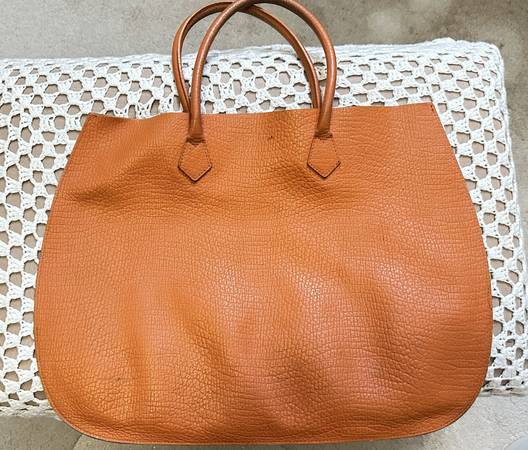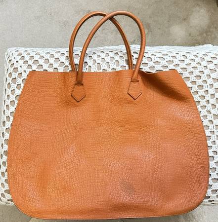 Beautiful genuine leather tote bag in a bold orange color. Large size, approx. 19" wide x 14" long (with handles 19"), perfect for everyday use, work, or travel.