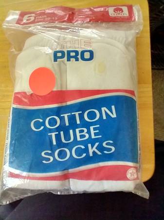 I have a package of Men's Cotton Tube Socks for sale. It is a pack of 6 pair made from 80% American cotton and 20% Polyester. They come brand new in the package. I am asking $5.00 cash.