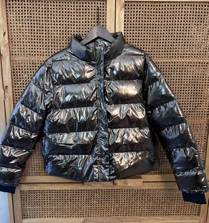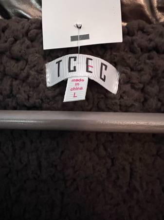 Metallic brown faux sherpa puffer jacket. Size Large. Has cuffed sleeves for added style, comfort, and warmth. Features a funnel neck and both front zipper and front snaps. Contains two pockets with snap enclosures. Could be unisex, but listed in women's sizing. Very warm and super cute!