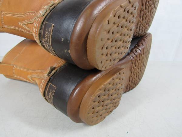 The boots are made of rubber lower , and upper leather which is 7 1/4" tall for the leather section. Good condition with some minor age and usage wear. No rips, tears, or holes. See photos