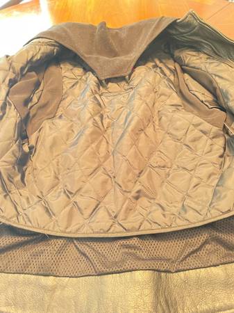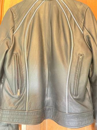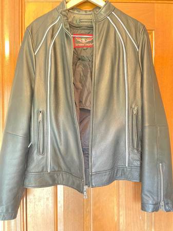 Womens Black leather jacket with zip out lining Size L Purchased at Wilson's Wore about 6 times on a motorcycle Like New Condition 30.00