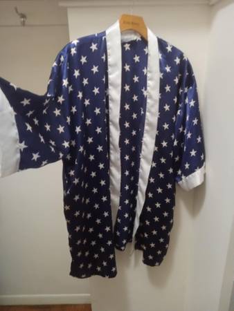 feels silky. one size fits all. perfect condition. can also be used as a vintage robe loungewear . 100% polyester