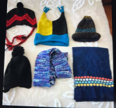 Cleaning out hats and scarves that have not been used in a long time. Sold as a bundle only. Four hats and two scarves.