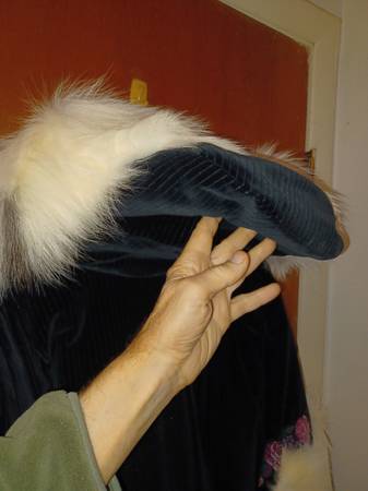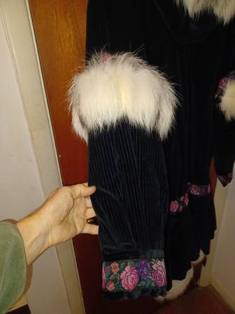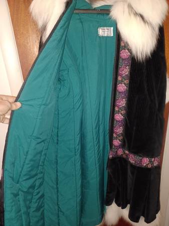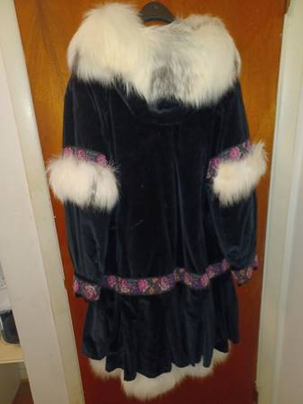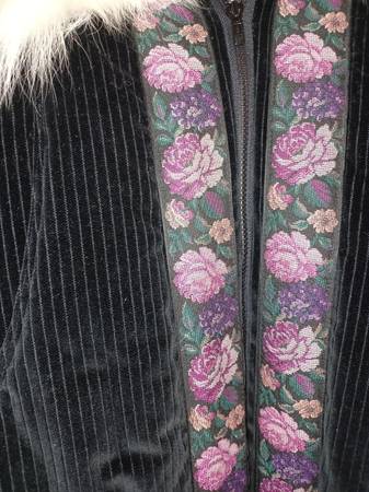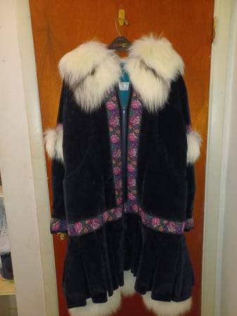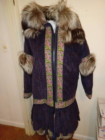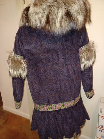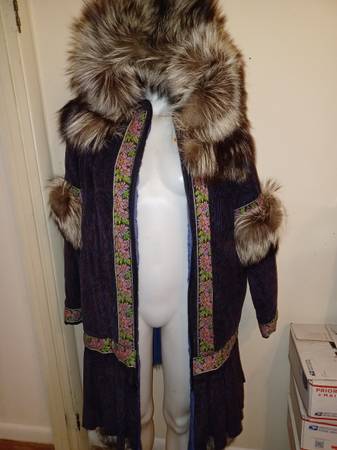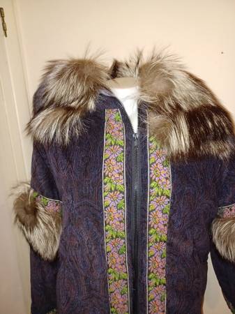 3/4 length Women's med/large coat Corduroy outer trimmed in needlepoint and with natural fox trim around hood and elsewhere. Insulated with holofil Custom made by the Parka Lady, Sharon Lewis, of Soldovia, Alaska. I have two, One in dark purple corduroy with Silver Fox trim, and another in Black with Snow Fox trim. Both new, never worn, $500 each.