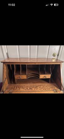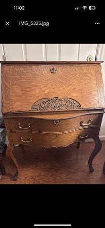 Beautiful antique oak writing desk with drop desk, drawers and curved legs. Please make as offer. As is