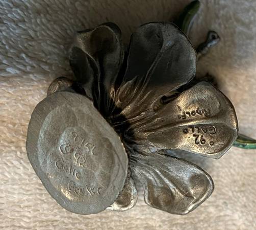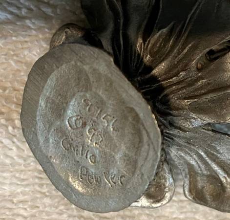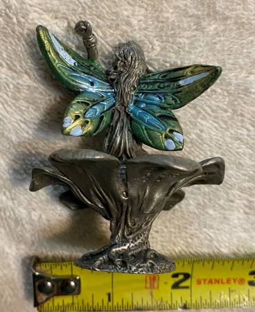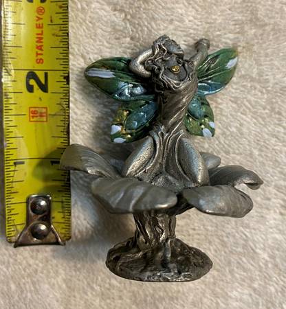 This Ridolfi Gallo pewter fairy "Spring Rain Kneeling on Flower" was made in the United States. The figure was handmade and hand painted. Ridolfi Gallo pewter figurines often feature fairy themes and Robert Ridolfi and Gallo, in some cases, are involved in the creation or production of these pieces. The figurine stands about 2.5" tall and weighs 3.15 ounces. Very nicely detailed and the figure is in very good condition overall.