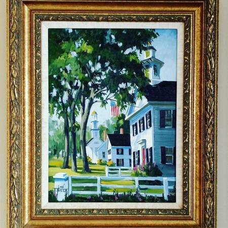Original oil on canvas. Vertical New England scene. 19"x22". Ornate gilded wood frame, linen mat.