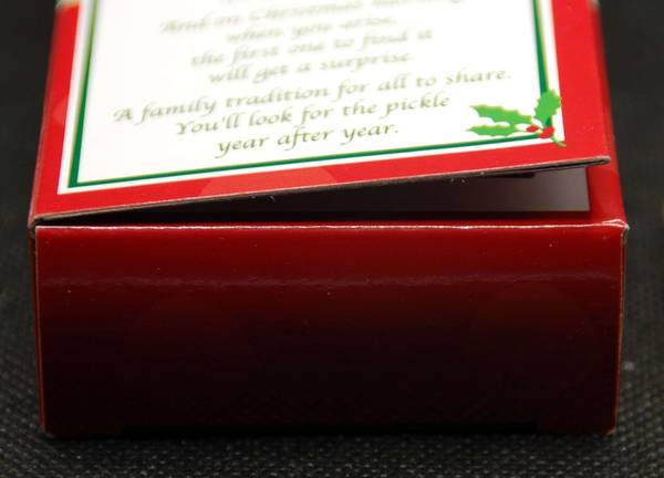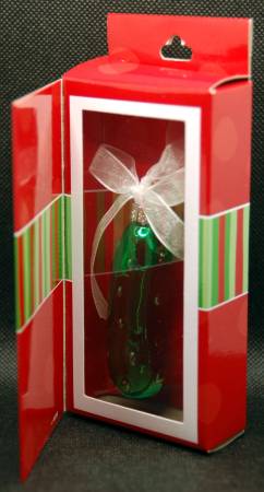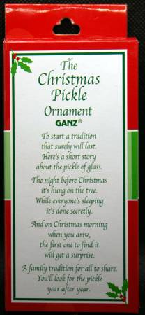 The Christmas Pickle Ornament by Ganz. In gift box. The front of the gift box has the following story: To start a tradition that surely will last. Here's a short story about the pickle of glass. The...