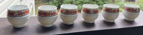 6 rare FP Zaječar Serbia ceramic cups. Each cup stands about 2 inches tall with a 2-inch diameter. These vintage ceramic pieces feature a striking geometric red, black, and yellow design band along the rim, characteristic of Yugoslav-era FP Zaječar ceramics.