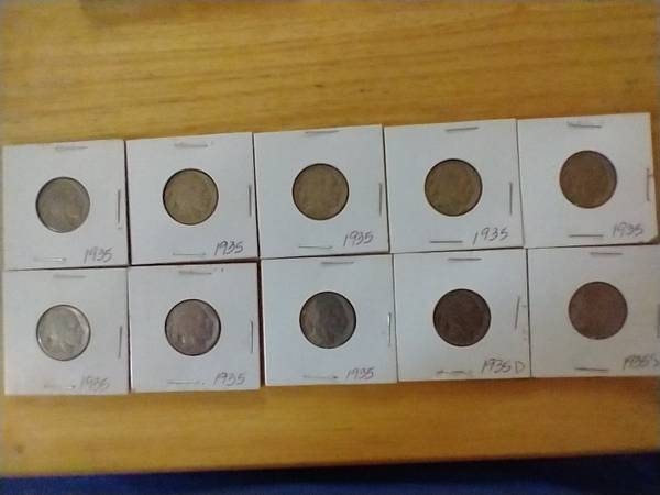 I have a group of 10 Buffalo Nickel Coins for sale. They come in a cardboard flip. I have the following dates available: 1935 Qty 8 1935-D 1935- S I am asking $20.00 cash for this group of 10 coins.
