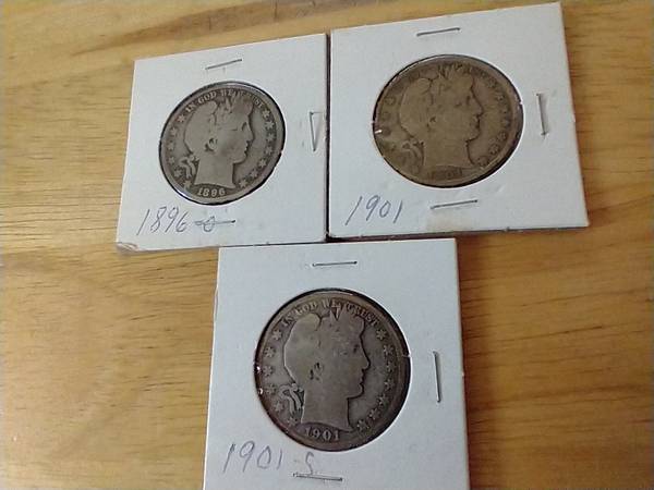 I have three Barber Half Dollar coins for sale. They are 90% silver and come in a cardboard flip. I have the following dates available: 1896-O 1901 1901-S I am asking $40.00 cash for each coin.