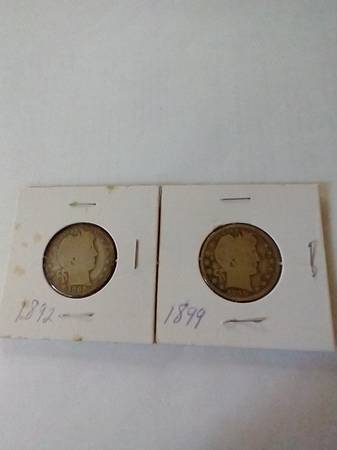 I have two Barber Quarter Dollar Coins for sale. They are 90% silver. I have the following dates available: 1892 1899 I am asking $11.00 cash for each coin.