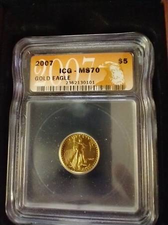 I have a beautiful 2007 $5 Gold Eagle Coin for sale. It is certified by ICG to be Mint State 70. It comes with a certificate of authenticity and is displayed in a cherry wood box. I am asking...