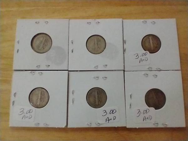 I have six Mercury Dimes for sale. They are 90% silver. I have the following dates available: 1918 ( 2 available ) 1925 1928 ( 2 available ) 1939D I am asking $3.00 cash for each coin.