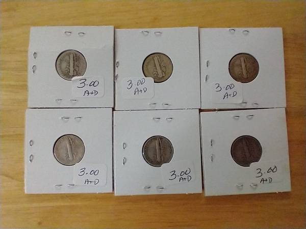 I have six Mercury Dimes for sale. They are 90% silver. I have the following dates available: 1927 1934D 1935 1940 1940S 1941D I am asking $3.00 cash for each coin.