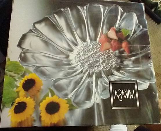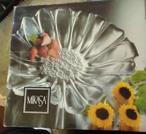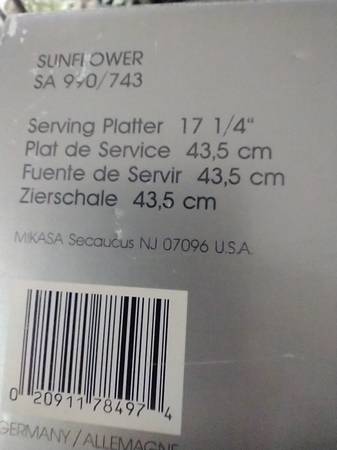 I have a Mikasa Frosted Sunflower Embossed Serving Tray for sale. It comes to you still brand new in the box. It is made in Germany and measures 17 inches. I am asking $50.00 cash.