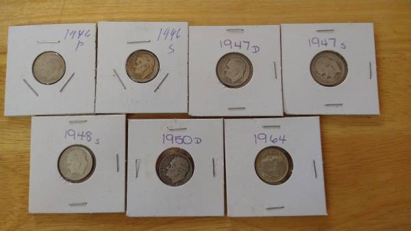 I have seven Roosevelt Dimes for sale. They are 90% silver. I have the following dates available: 1946 1946S 1947D 1947S 1948S 1950D 1964 I am asking $3.00 cash for each coin.