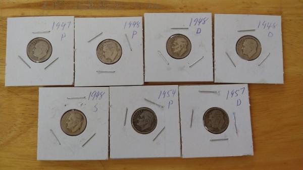 I have seven Roosevelt Dimes for sale. They are 90% silver. I have the following dates available: 1947 1948 1948D ( 2 available ) 1948S 1954 1957D I am asking $3.00 cash for each coin.