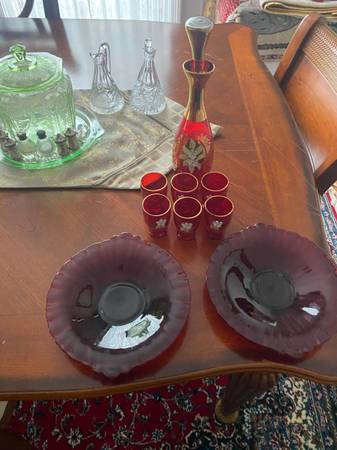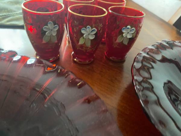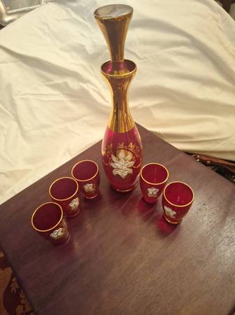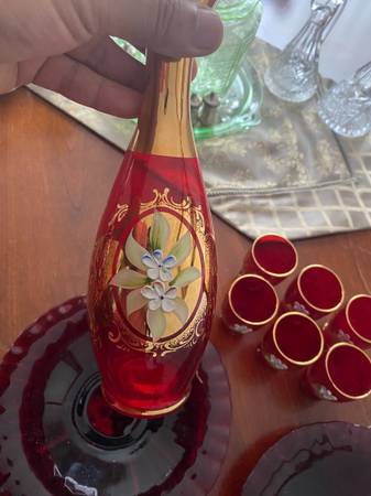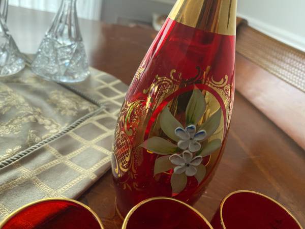 🧐 Note: This set was purchased for its beauty and craftsmanship. Based on online research, it may be labeled as Bohemian Glass Gold Enamel Ruby Red, Venetian Bohemian Italy Hand-Painted Glass, or Vtg Murano Red Venetian Glass Enamel Flower. Exact origin is uncertain, but the artistry speaks for itself.