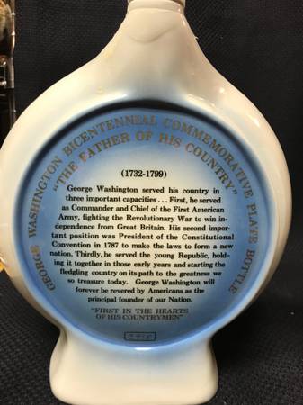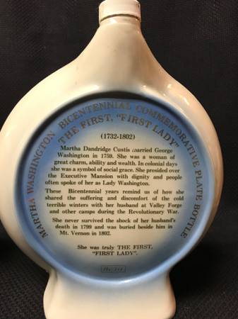 Vintage George and Martha Washington bicentennial Jim Beam liquor bottles. 1776 - 1976. USA. Each bottle measures 10 inches in height and 8.25 inches in width. The bottles are a beautiful turquoise or deep robins egg blue color with perfect pictures of George and Martha encircled on the front of each bottle. On the back of each bottle is a brief history of each of the individuals. “First in the hearts of his countryman” would certainly describe George Washington. That bottle is C915. Martha Washington‘s history is also on the back of the bottle. She was “truly the first First Lady” and the number of that bottle is HD711. There are no cracks chips crazing or repairs on either of the bottles. Excellent condition and great for your Washington DC collection.