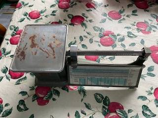 1964 USPO scale - weighs up to 4 pounds. Scale goes by 0.5 ounces. A little rust on the top of the scale.