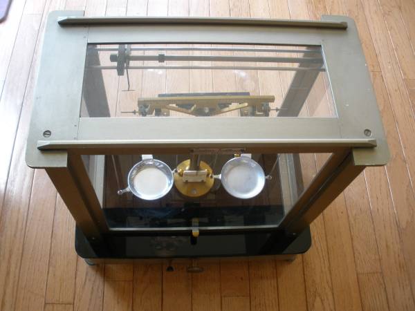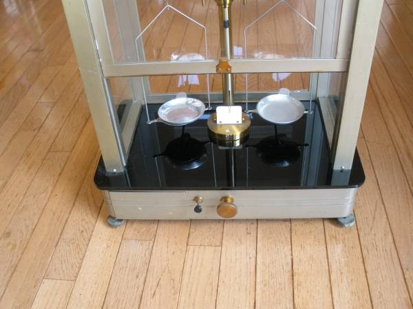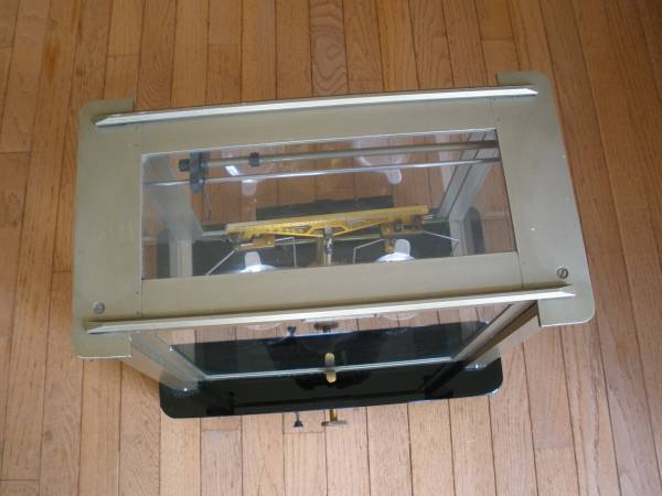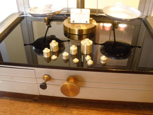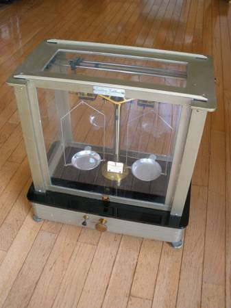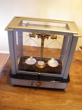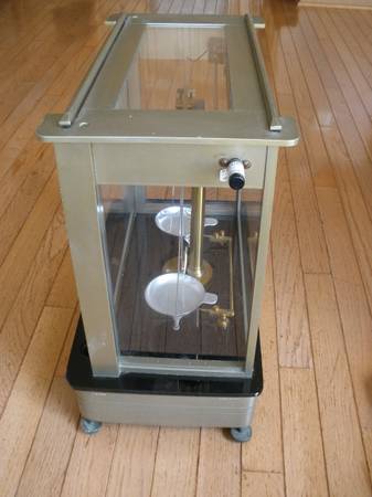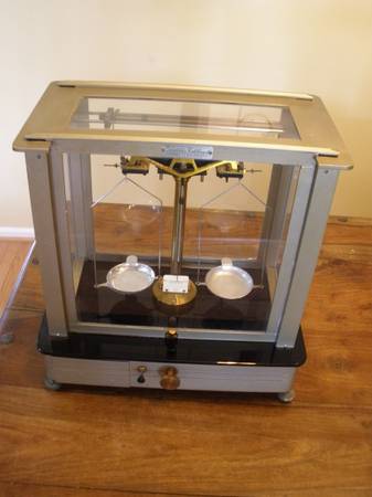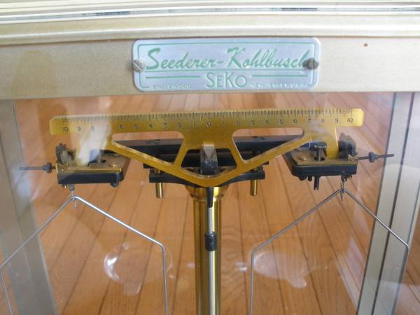 For sale is an Antique SEEDERER-KOHLBUSCH BENCH MODEL BEAM BALANCE SCALE from Englewood, New Jersey. This working apothecary scale is great condition. The metal scale case measures 16 1/2" wide, by 9 3/4" deep. The scientific scale stands about 18" tall. Both of the long glass panels slide up and down. The top of the scale has a black glass top. The scale and adjustable metal legs and an air bubble in the middle allows you to ensure the scale is perfectly levelled. The sale of the scale includes small brass weights to measure grams. A great collectible apothecary balance beam scale.