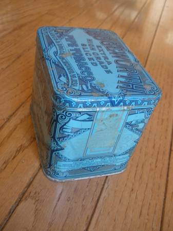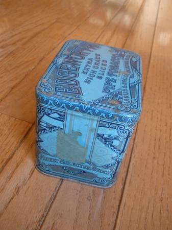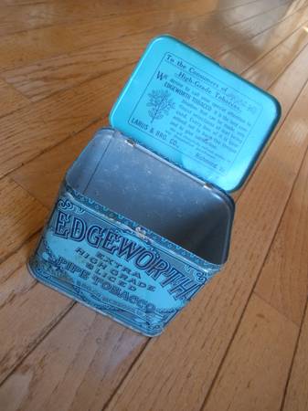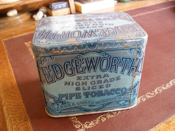 For sale is an original 1930s EDGEWORTH EXTRA HIGH GRADE PIPE TOBACCO TIN with a hinged lid from the Larus & Brother Company, Richmond, VA. This handsome blue lithographic tin has the remnants of a paper tax stamp. Tin measures approximately 4 1/4 inches by 3 1/4 inches by 3 1/2 inches tall. A great addition to a any tobacciana collection.