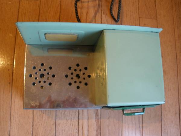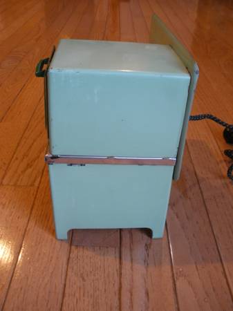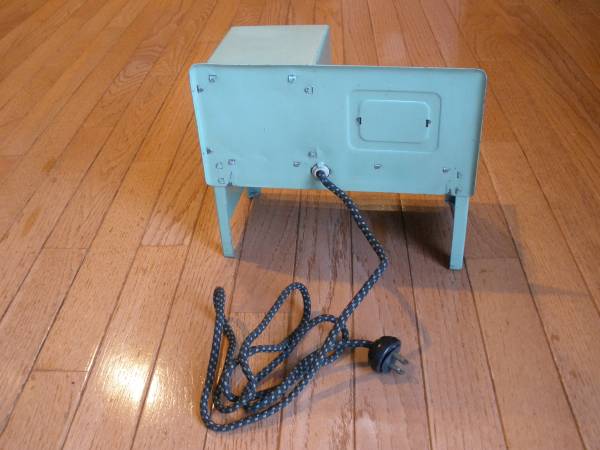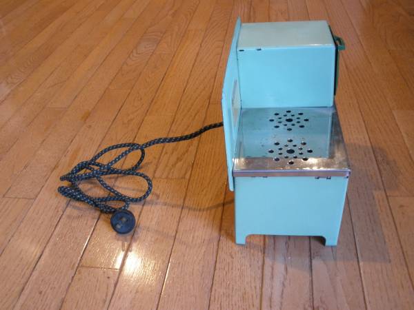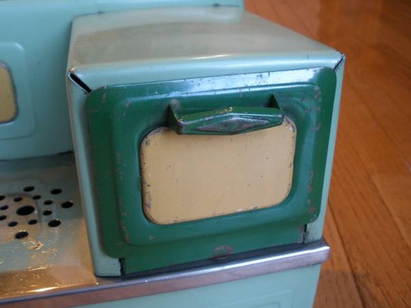 For sale is a working 1930s GREEN METAL PLUG-IN TOY STOVE with a cloth covered electrical cord. This toy was probably made by the Girard Manufacturing Company. The Girard Company was in business from 1922 through 1935. The top has two burners and an oven. The base is designed to appear as if there are three cabinet doors. The stove measures 10 inches long, 8 1/2 inches tall, and 5 inches deep. This toy is the dangerous predecessor for the much safer Easy Bake Oven. The heating elements for this ill-advised electric stove still work. Use of this toy stove is not advised due to risk of electrical shock, fire, and burns. The stove is in overall great condition and has its original paint. A great collectible toy.