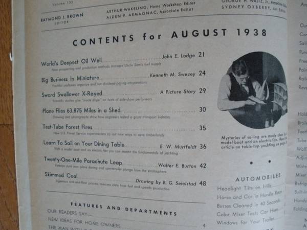 For sale is an August 1938 edition of POPULAR SCIENCE MAGAZINE, Volume 133, no 2. Cover features a recording breaking high altitude parachute drop. A cool science and technology focused magazine with articles on "Sword Swallower X-Rayed"; "Twenty-One-Mile Parachute Leap"; "World's Deepest Oil Well"; "Ball Game for Blind Players"; and "Treadmill Walks the Dog"; and others. Magazine has interesting adverts for Union Leader Tobacco; Royal Typewriters; Learn to Mount Birds; Prince Albert Tobacco; and the new 17-Tube World Wide Radio. Magazine is complete with all 102 pages but has some soiling, minor interior page tears and edge wear consistent with age. Overall fair condition for magazine older than 75 years. Magazine measures 8 1/2 inches by 11 1/2 inches and would frame well. A great ephemera collectible.