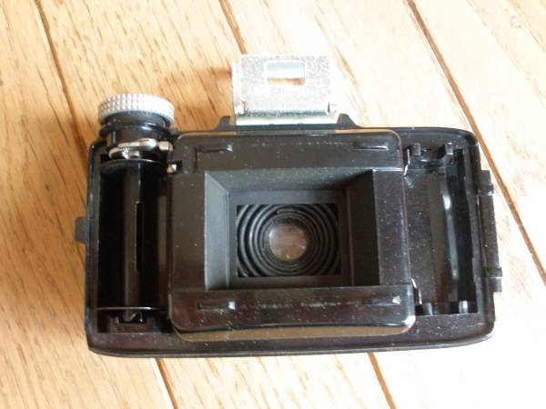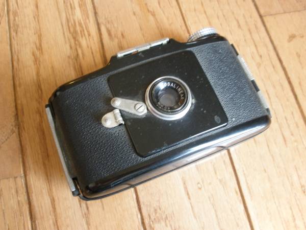 Kodak produced Bantam camera from 1935 to 1948. The Bantam F8 camera, designed by industrial engineer Walter Dorwin Teaque, is a simple point-and-shoot camera. This camera's body is made out of molded black Bakelite. This camera used 828 rollfilm format, which is a paper backed rollfilm with only one registration hole per frame.