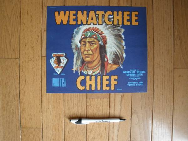 For sale is a an original 1940s WENATCHEE CHIEF CRATE LABEL from the Wenatchee Wenoka Growers Association, Wenatchee, Washington. This colorful label is in excellent condition. The label is marked with a 1948 copyright date. The large label measures about 8 1/2 inches by 10 inches. A nice advertising collectible.