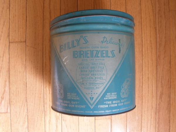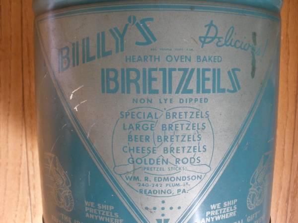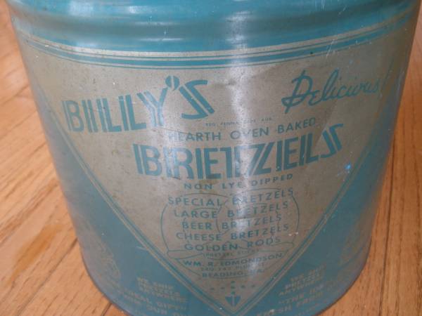 For sale is a 1950's BILLY'S BRETZELS & PRETZELS TIN from W.M. R. Edmondson, Reading, PA. This green and silver vintage tin features the iconic flying pretzel logo. This tin is in very good condition but has some surfaces scratches and some small rust spots. The tin measures about 9 inches tall and 9 1/8 inches diameter. A nice collectible tin.