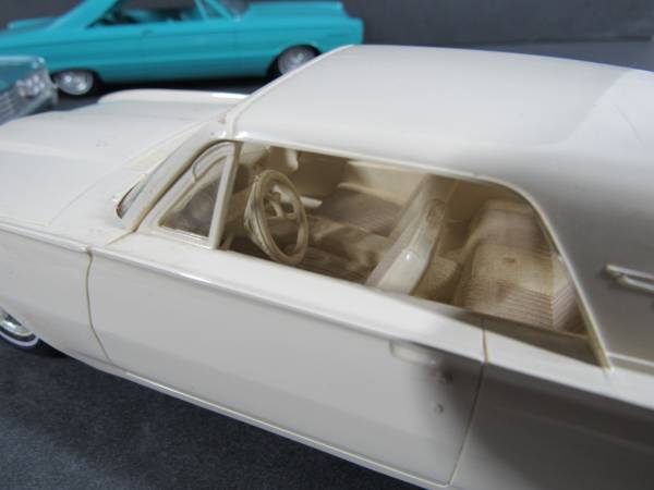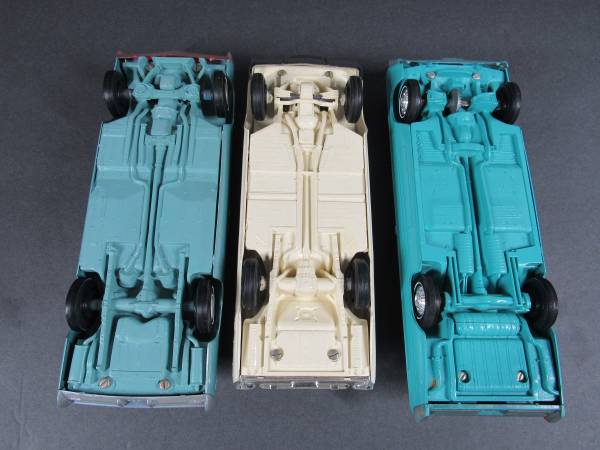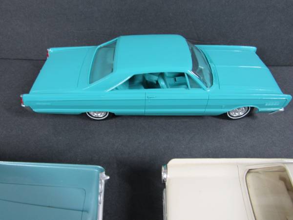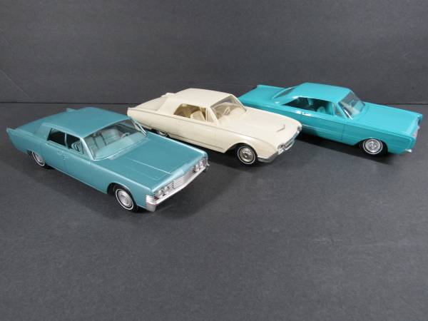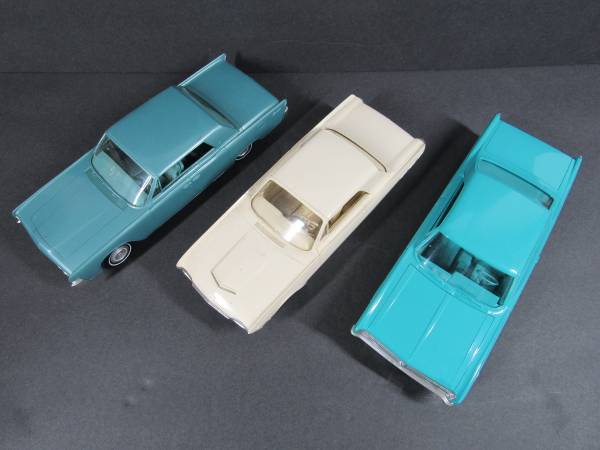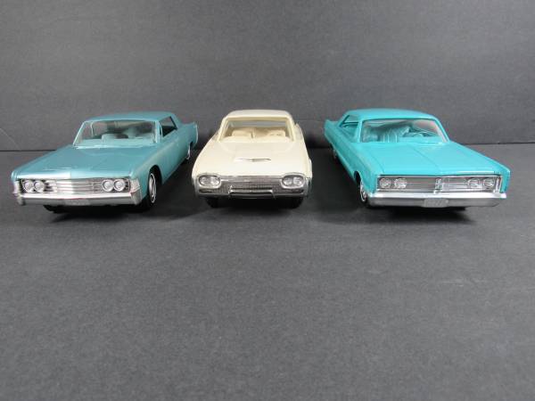 The lot of unbranded promo cars are made of plastic bodies, rubber tires with steel axles. The set includes 1962 Ford Thunderbird 8" length, 1965 Lincoln Continental 8 9/16" length, and 1966 Mercury Park Lane 8 13/16" length which is the only model that is a friction car that is functioning. Good condition overall with some typical age and usage wear scratches and scuffs.The Continental has a left center pillar missing, and the right center pillar is cracked. Car models will need some interior detailing. I am selling this as a lot and will not be separating them. Thank you for your consideration.