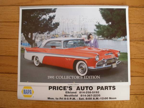 For sale is a vintage 1991 COLLECTOR'S EDITION NAPA GIRLS & CLASSIC CARS CALENDAR. This 12-month advertising calendar is complete with each month featuring a different classic car and a different lady model with 1980s big feathered hair. The calendar is in very good condition with some minor staining on some of the pages. The calendar measures 14 inches by 10 inches. This NAPA auto parts calendar series started in 1979 and this is the twelfth in the series. The cars in the calendar include the 1970 Plymouth, 1968 Fiat, 1965 Ford, 1963 Oldsmobile, 1967 Chrysler, 1957 Chevrolet, 1966 DeSoto, 1953 Muntz-Jet, 1948 Tucker, 1940 Lincoln, 1937 Packard, and 1935 Terraplane.