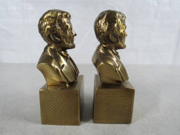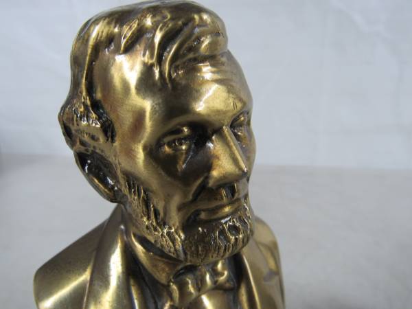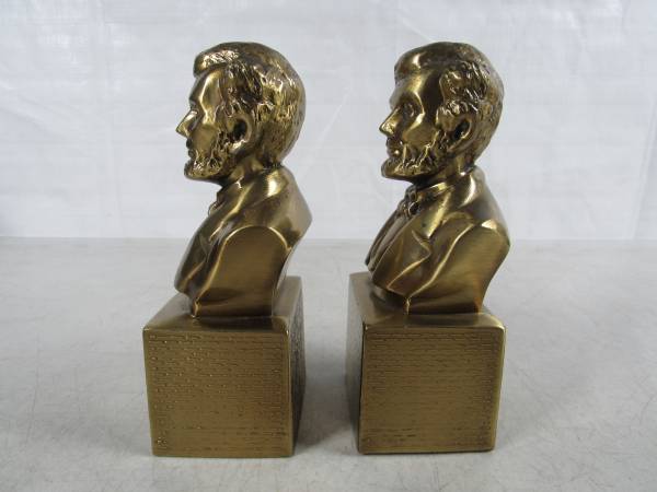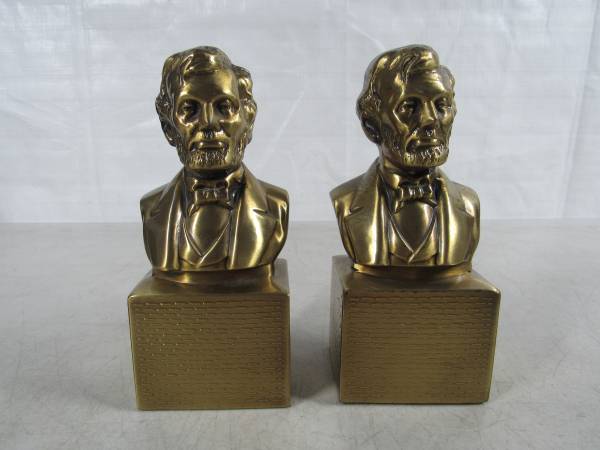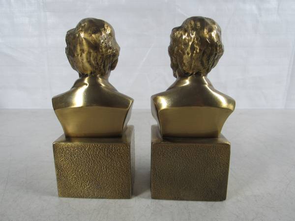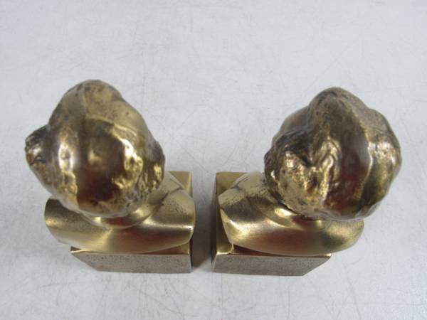 The bookends are 6 1/8" height X 2 3/4" width X 2 1/4" depth. Made of solid brass, and weighs 5 pounds approximately together. Good condition with one bookend missing the felt material on the bottom...