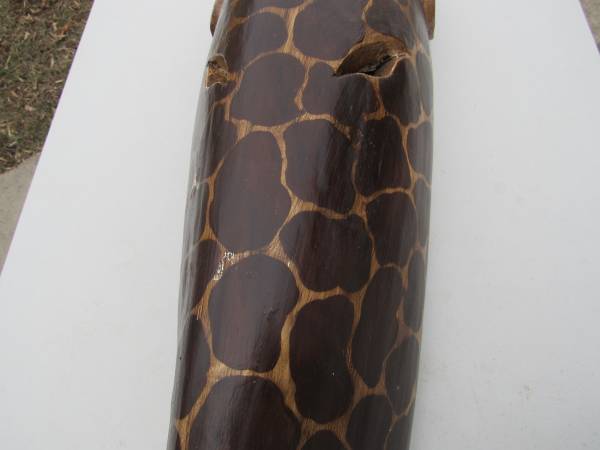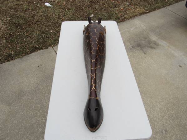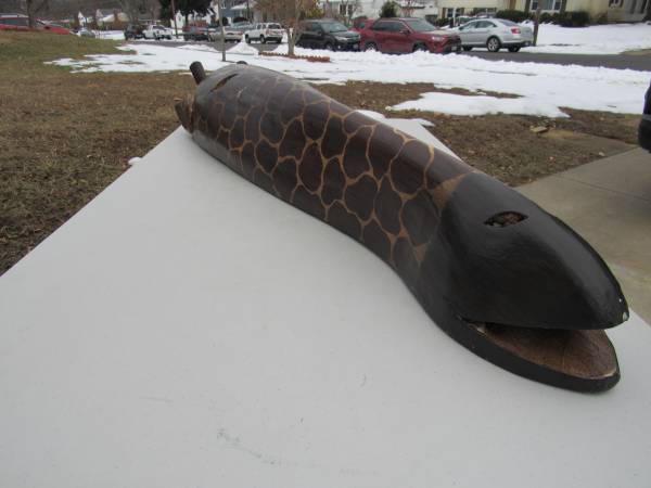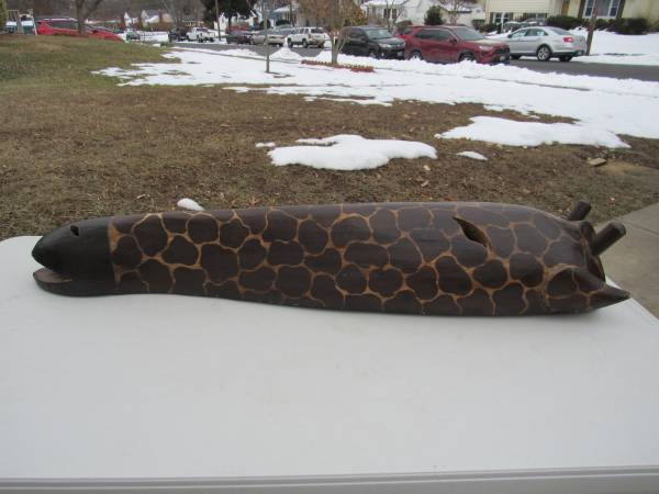 The native tribal Giraffe mask is 38 7/8" height X 8 1/2" width X 6" depth. Made of hand carved wood. Good condition with some minor age and usage wear. No broken or missing parts. See photo's