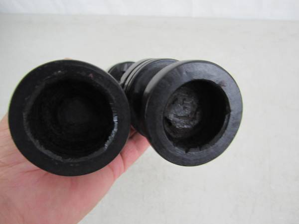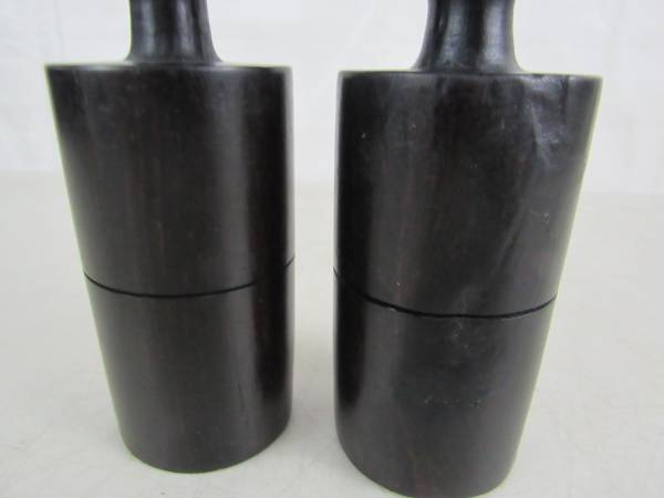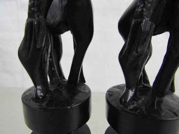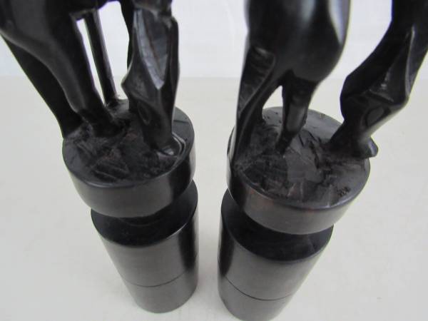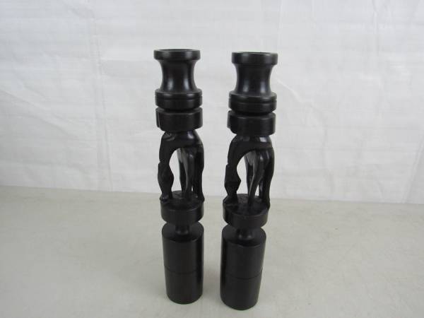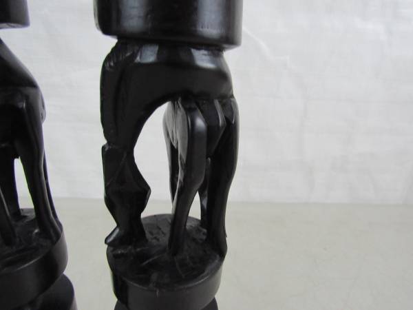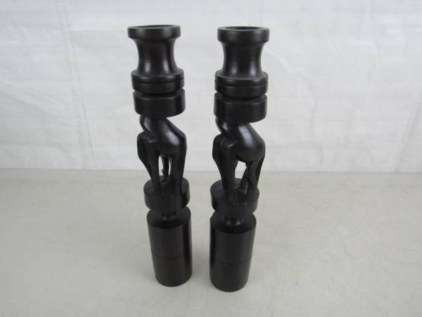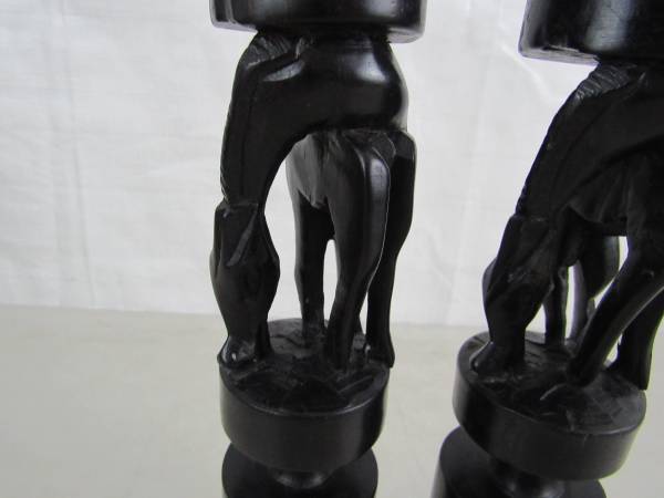 The candle holders are 11 1/2" tall, and made of a dark type of hard wood that is possibly ebony or ironwood. To be used for tapered candles, and the diameter for the candle holder section is 1/ 1/4", and the depth is 5/8" approximately. Good condition with some minor imperfections in the carvings, and there is a chip and a split in the wood at the left front hoof area of one candle holder.