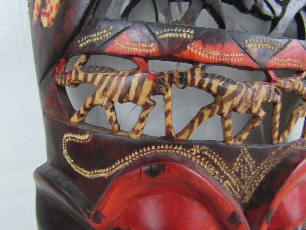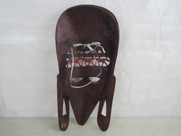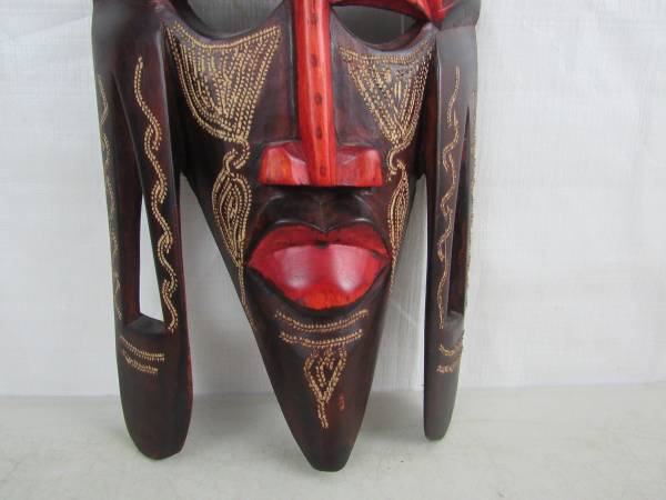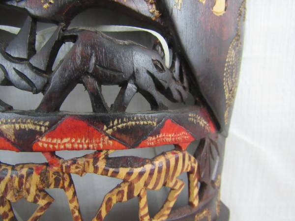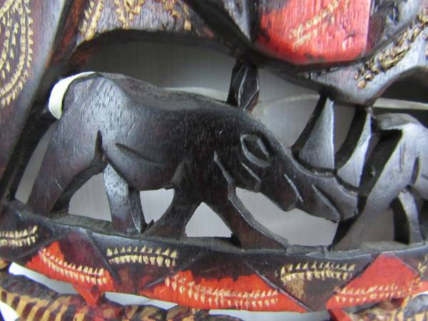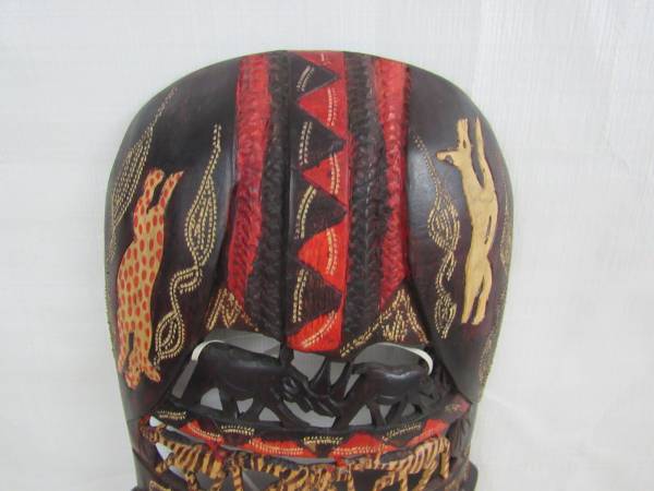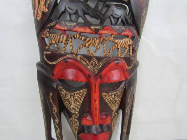 The wooden Tribal mask is 14 1/2" height X 6 3/8" width. Has an African safari wildlife theme. Very good condition. No broken or missing parts. See photo's