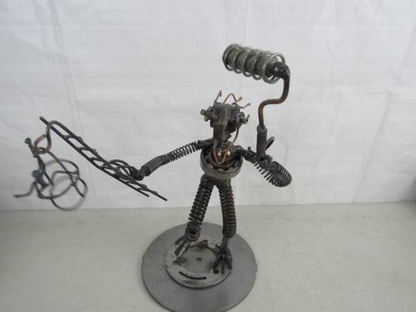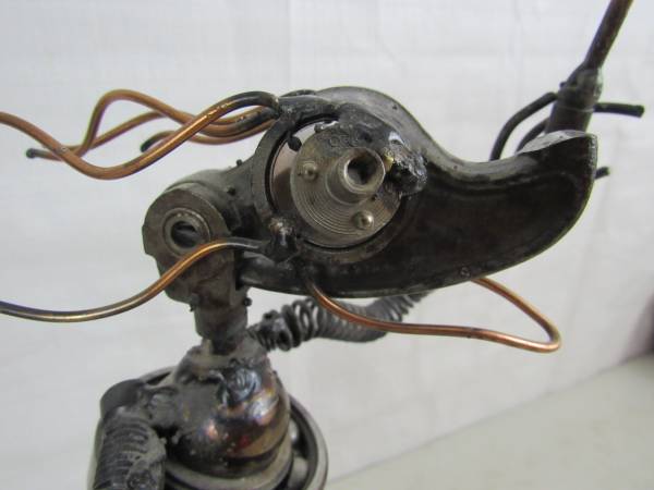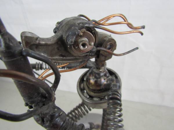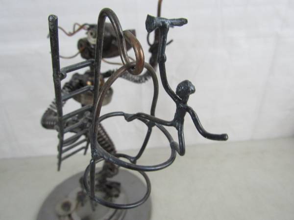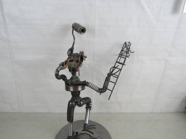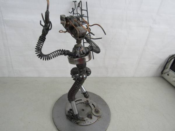 The metal Alien sculpture is 16" tall, and weighs 7 pounds 6 ounces. Made of scrap metal parts of cast iron, steel, copper, and aluminum. Very good condition. No broken or missing parts. See photo's