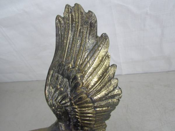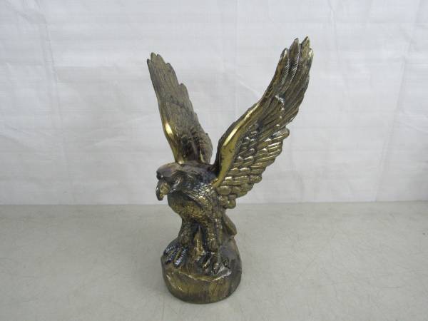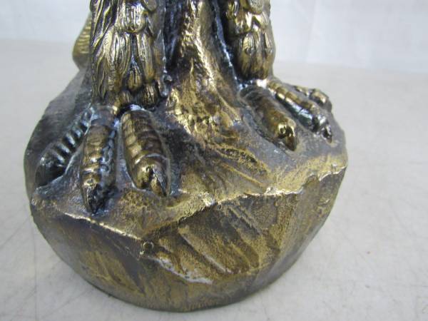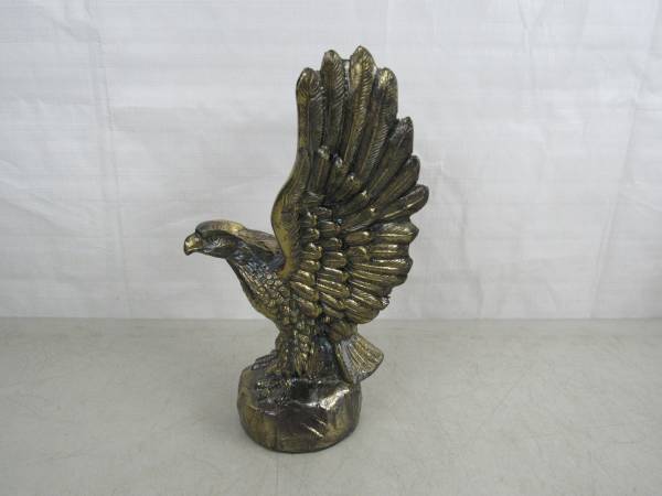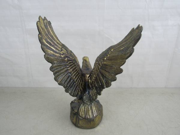 The Bald Eagle is 11 3/4" height X 8 5/8" wingspan width X 7" depth. Made of brass plated cast metal, and weighs 3 pounds 6 ounces. Good condition. No broken or missing parts. See photo's