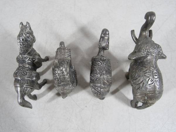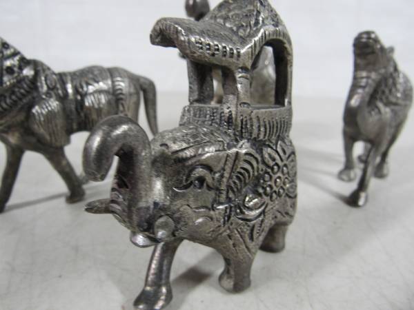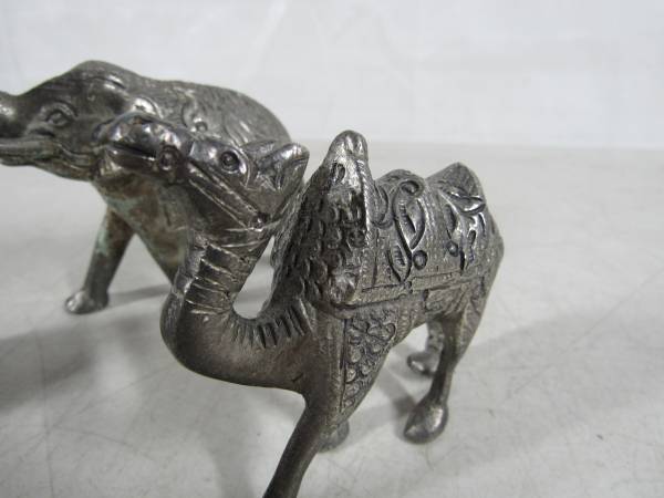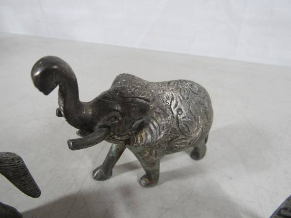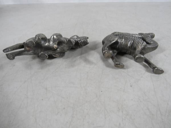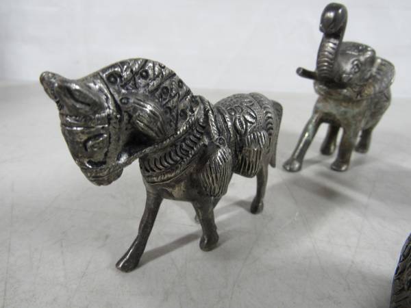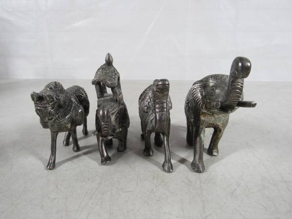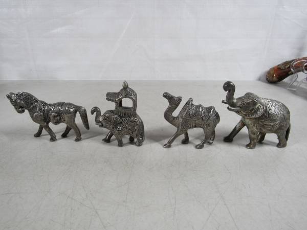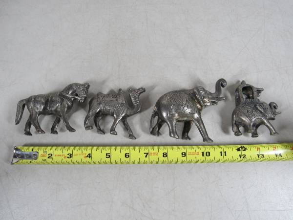 The largest Elephant is 3 3/4" length X 3 1/2" height. The horse is 3 7/8" length X 2 5/8" height. The animals lot is made of metal which is possibly cast aluminum or pewter. Good condition with some minor age and usage wear. No broken or missing parts.