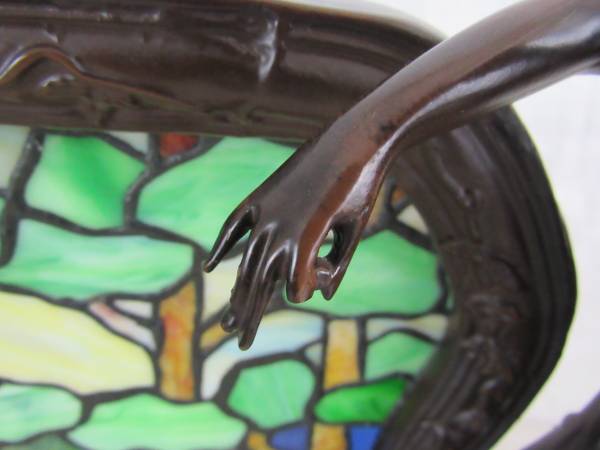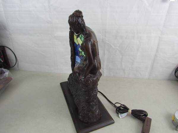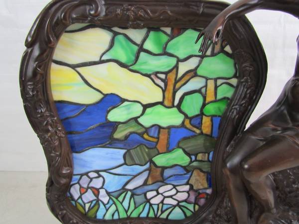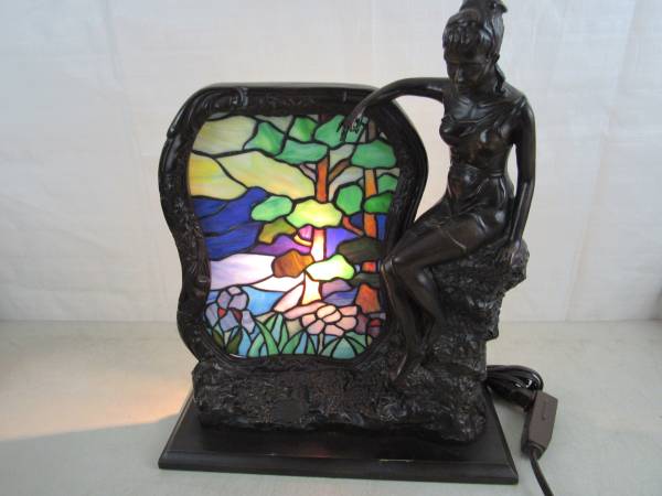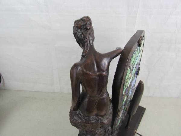 The lamp is 17" height to the top of the lady's head X 14 1/8" base width X 6 1/4" base depth, and weighs 15 pounds. The lady and the frame is made of an epoxy type of materiel, and the same with the stained glass. I could not find an exact item like this, and especially this size. Good working condition and the only issue is the lady's right hand pointer finger is broken off about 5/16" approximately. Minor age and usage wear.