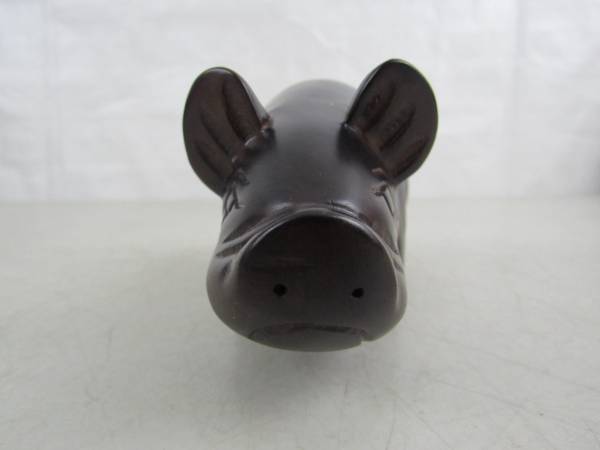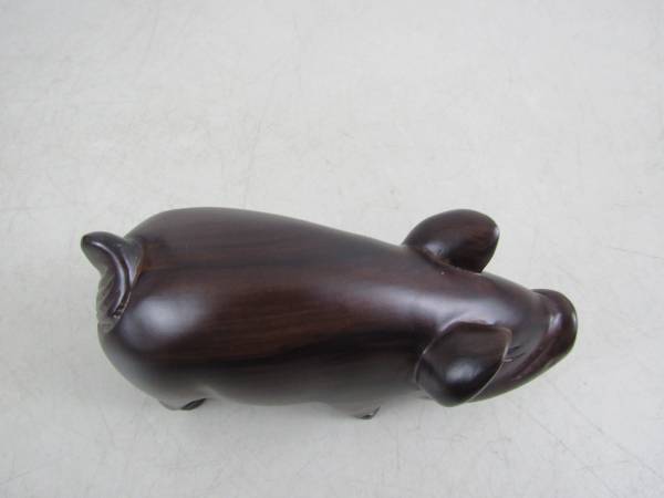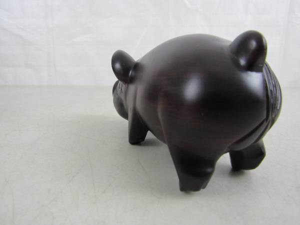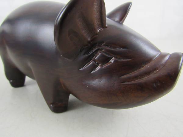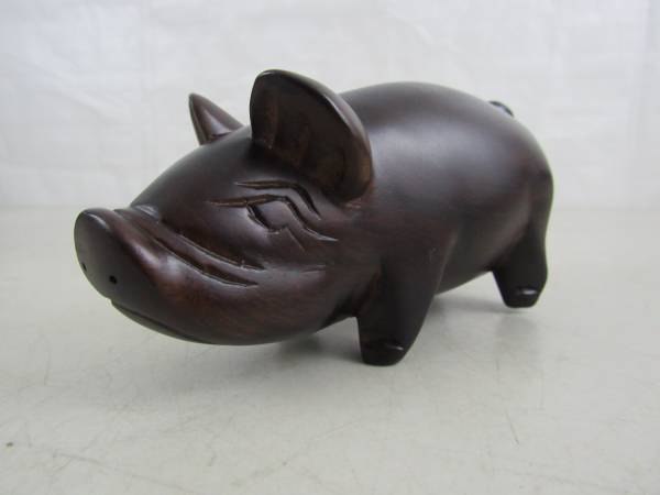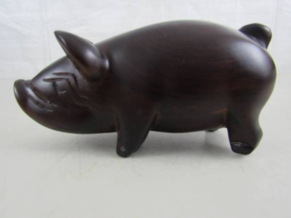 The pig is 6" length X 2 3/4" height X 2 1/4" width, and weighs 10 ounces approximately. Made of solid wood. Good condition. No broken or missing parts. See photo's